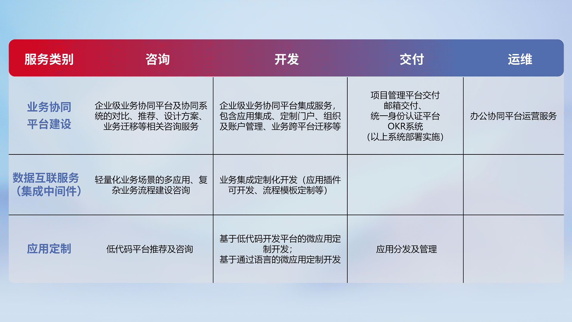 针对钉钉、、企微、、、、IDaas等平台级产品提供产品的规划、、方案、、、、交付、、、、定制化开发等服务,,,实现如统一协同办公、、、智能客户服务、、混合会议管理、、智能数据查询、、、、等业务场景,,,实现数字化转型。。。